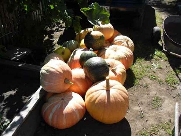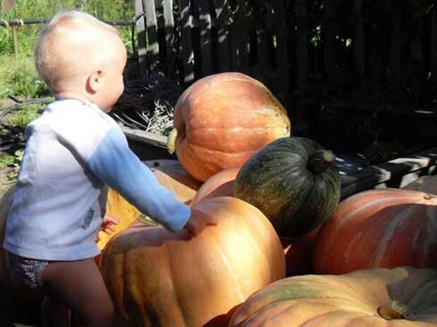 Вот эта "кучка", что на первом фото, вызвала среди соседей чрезвычайный переполох. Толпой повалили на смотрины. Все хором говорили, чтобы я вез свою тыкву (самая большая килограмм 20, а то и больше) на ярмарку. Но, послушав в телевизоре, что перед тем, как попасть на эту ярмарку, нужно куда-то подавать какую-то заявку, я плюнул на эту бюрократию, и никуда не поехал. Так что не знаю, переплюнул ли меня кто-нибудь в части выращивания тыквы в открытом грунте на Камчатке. В Европе-то точно перещеголяли. Один фермер вырастил тыкву весом 520 килограмм. Ну, он ее специально выращивал, а у меня что выросло, то и выросло...